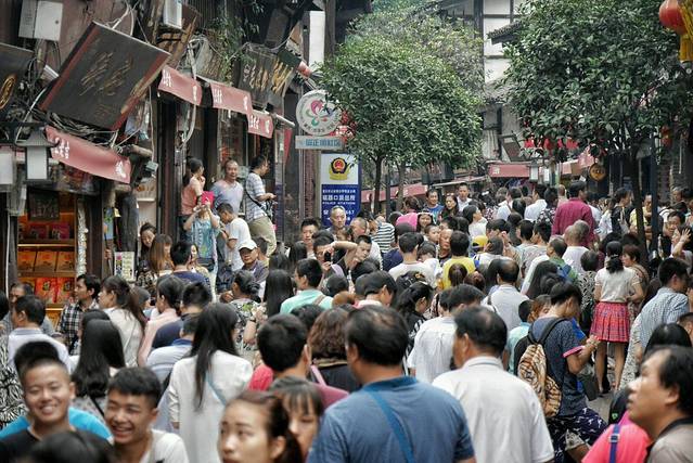 磁器口主要道路被塞得严实,只得顺着人流挪动。