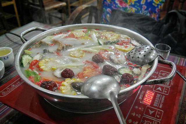 初见菜单总觉得价格坑爹,实际吃了半个钟头才发现这一锅东西又是根本吃不完。特色在腊排骨,根根连着骨头,来到藏区后肉食就没有失望过。本地不常见的蔬菜倒变得稀罕。吃饭花了280元。