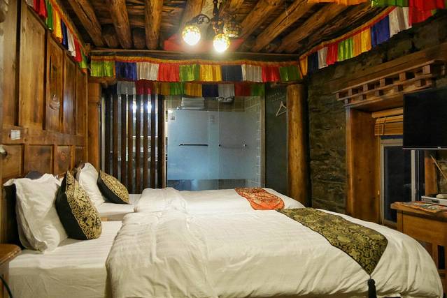 客栈就开在独克宗古城边上,青旅配置,每晚有投影小电影放映,还有活泼的招财猫看家,适合年轻人落脚结伴。