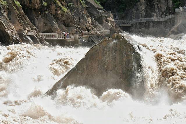 上虎跳是整个虎跳峡较窄的一段,中间有巨石劈开湍急的水流,浪拍巨石水花飞溅,硬碰硬的力量对刚。