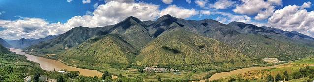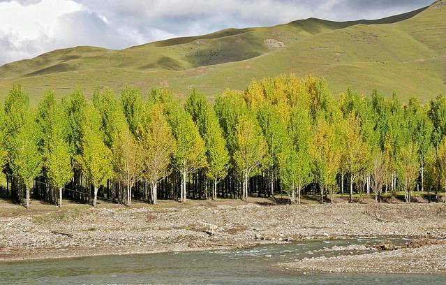 午饭后开过金沙江上的桥便进入香格里拉境内,道路两侧的山不比在宁蒗境内那么有压迫感,同时渐渐进入藏区,建筑风格开始变化。