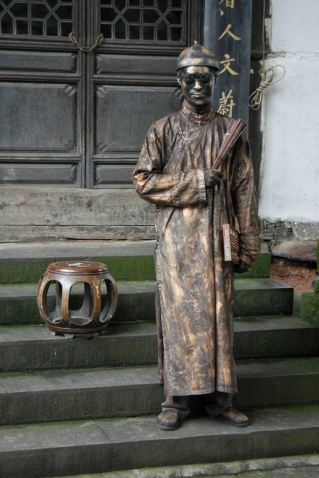 铜人君一惊一乍地吓唬着路人,除了脸部可以看出一些端倪,其他部分没差了。