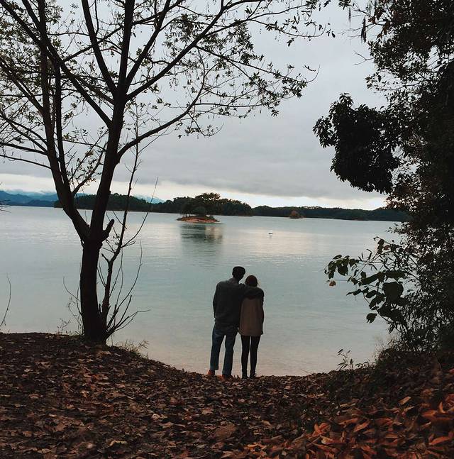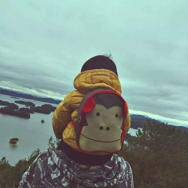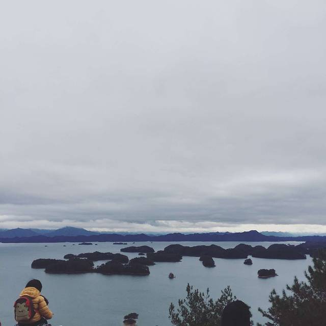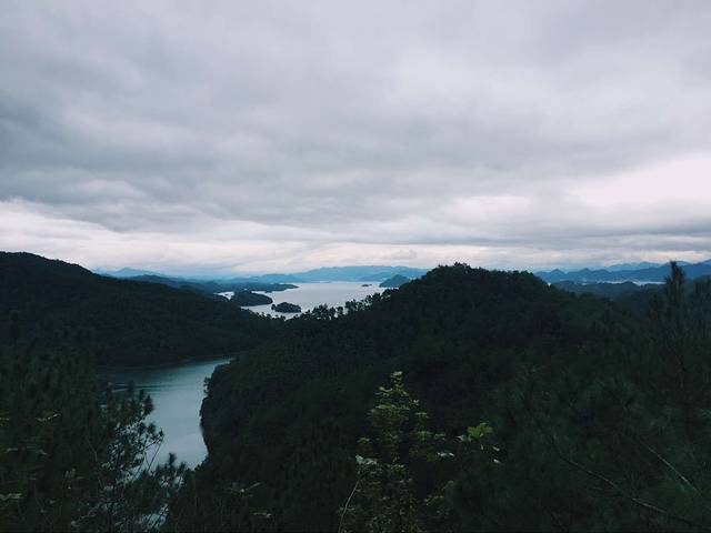 我们的船一路前行,到了梅峰岛,船靠岸了。我们一行人上得岛来。俗话说:“不上梅峰观群岛,不识千岛真面目”,这里因生态环境绝佳而被确定为千岛湖的一级景点。沿着石阶我们一路往上走,岛上绿树葱茏,呼吸着清新的气息,陶醉在湖光山色的胜景中。青山和绿水陪伴着我愉快的旅程,走得累了,我门就在第一个山腰山坐了一会儿,身在此处,心已远行。我真不愿意走动,就此长坐吧,但旅途匆匆,是不允许我们长坐的。使劲地走上最高的观景台,在高处看千岛湖美不胜收的景致,让我的思绪飘向更远的远方,真爱永恒,真情永存。千岛湖变成了一块寻求真爱的圣地,牵着你的手,我愿意花光我此生最大的运气来定格在这一刻。站在高处,俯视千岛湖,港汊纵横,湖面绿如翡翠,散落在天底下,让我们感觉天、地、人的和谐统一,自然、亲切、妙曼、悠远,井然,天公不作美,缺少那一份暖暖的阳光~
