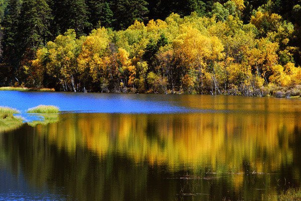 缤纷彩林在如镜的碧塔海中形成的绚烂倒影。