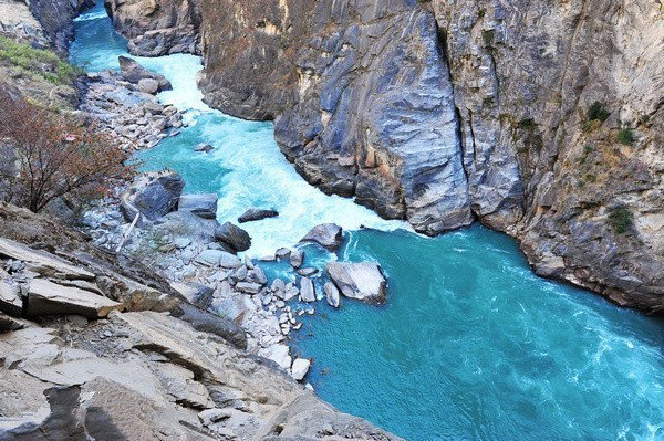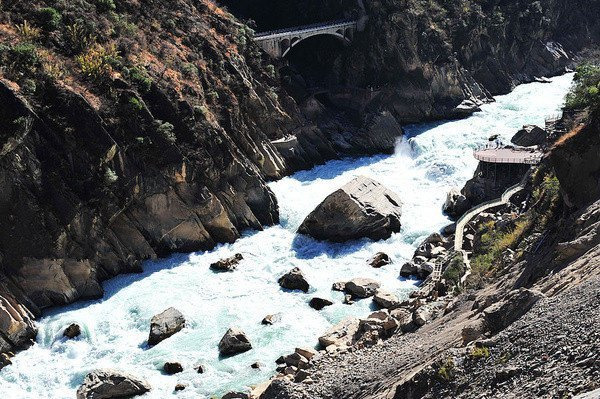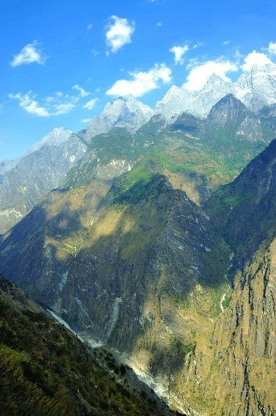 这是虎跳峡最壮观的一段中虎跳峡,两岸山涯垂直陡峭、如刀削笔直,象一道巨大的石门试图截流江水,故得名“一线天”。