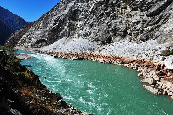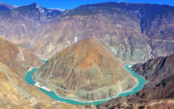 清澈的金沙江如同一条绿丝带穿梭于高山峡谷间。