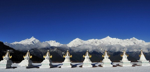 在飞来寺也有一个比在迎宾台更大的一个观景台,这里供奉着八座洁白的佛塔,从观景台可以将这一排整齐的佛塔与梅里雪山同时拍下来,这也是拍摄梅里雪山最经典的角度。