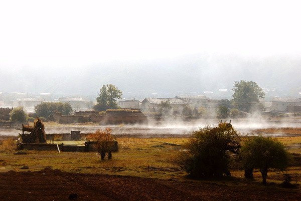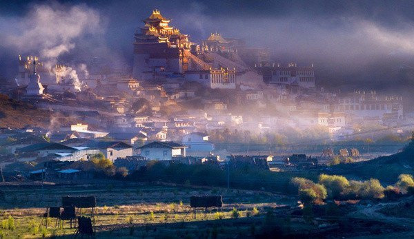 松赞林寺依山而建,外形是仿西藏拉萨的布达拉宫,集藏族造型艺术之大成,因此也被称为”小布达拉宫“。清晨的松赞林寺晨雾燎绕,桑烟四起,更显神秘宗教色彩。