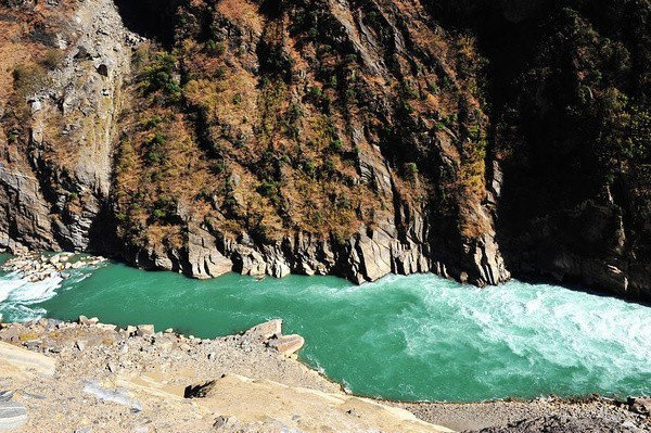 由于秋天进入云南的旱季,此时金沙江的水量偏小,流速较缓,江水幽青碧绿,非常招人喜欢。