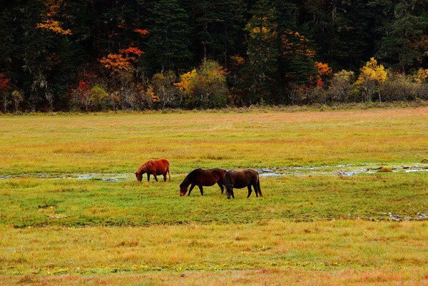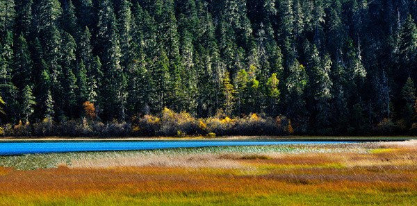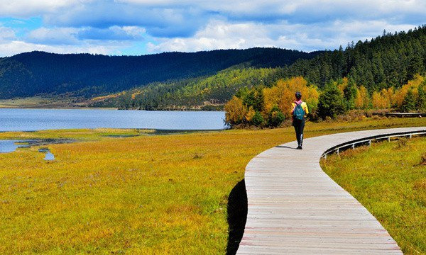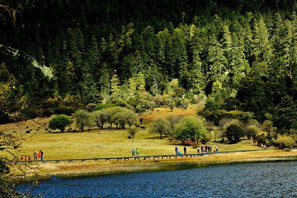这是普达措中的另一个美丽湖泊—属都湖,金黄草甸将美丽的属都湖点辍的更加五彩斑澜,美不胜收。
