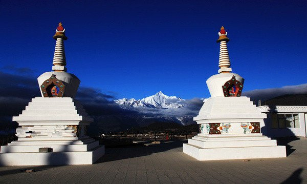 十三迎宾塔观景台也是欣赏梅里雪山的最佳位置之一,雄伟的梅里雪山耸立在蓝天下,气势磅礴、震憾无比。