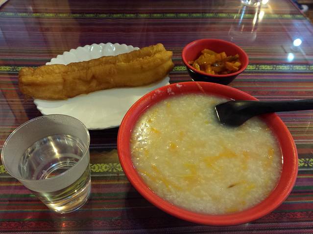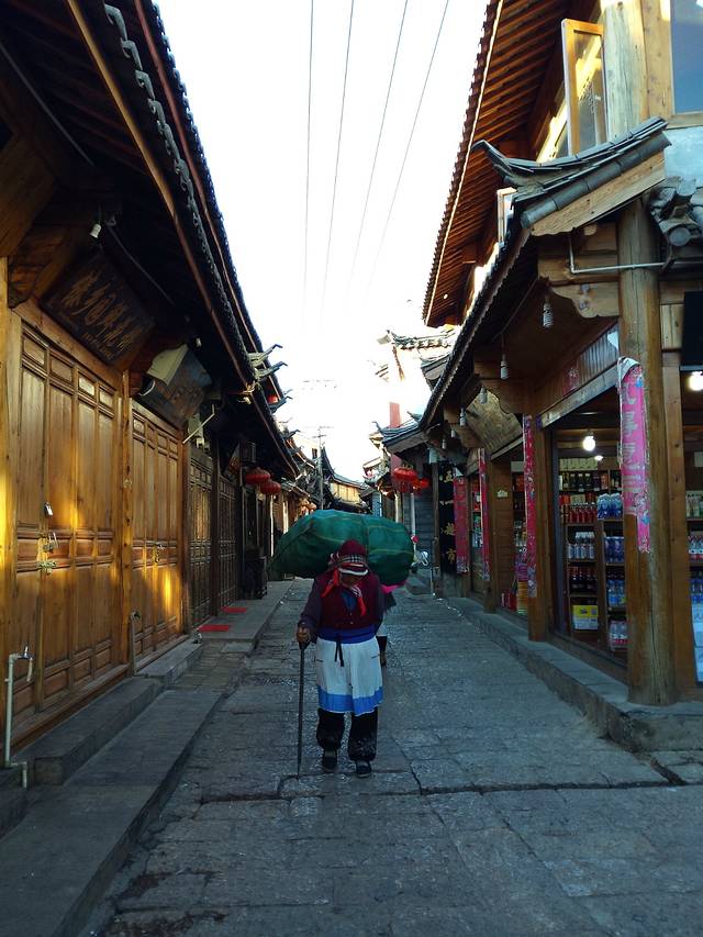 第二天,我们两个都贪睡了会儿,睡到八点多才起床。收拾完,出了房间,才发现,我们有多勤快,整个客栈只有我和荣荣起床了,连老板家的Amada都没起床。O(∩_∩)O哈哈~想着我们的云南之行不是在做梦,已经开始了,我们顿时没了睡意,打算出门逛古城。 清晨的古城,阳光很清冽,虽是穿了大衣,但是我和荣荣还是稍微有点冷。整个古城很安静,不时可以看到穿着民族服饰路过的老奶奶,还有哼着民族音乐的垃圾车,刚刚开门做生意的老板....出于肚子角度,我们还是先打算吃点早点。在附件找了一家小店,老板很好,一进门就热情打招呼,然后给我们接了两杯热水暖手。不过点菜时,我又要吐槽一下了,看了菜单前面的菜名,都很想吃,看了后面的价格,我真的更冷了,一碗番薯粥也要十元。丽江的物价真的很高,后来听大理的导游小信姐说,丽江全民做导游,这里没有其他收入。如果大家想在丽江艳遇,想泡吧,单一米阳光酒吧,一瓶啤酒要在五六十块左右。 随便来了个番薯粥,一根油条,一份肠粉,这顿早餐算是解决了。走的时候,有进来拉客的人,才知道,原来丽江大研古城是要收古城维护费的,每人80元。还没有欣赏风景的我们,一致决定,先出城玩,晚上回来再逛古城(下午五点半之后,就没有人收古维费了)。