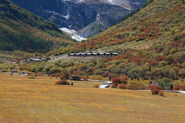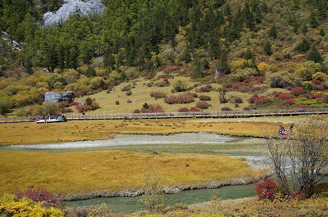 从冲古草甸到洛绒牛场可以坐电瓶车,也可以选择走步道,根据自己的时间安排吧。步行上去大概一个小时左右,主要看沿途花多少时间拍照 电瓶车的话大概十五分钟吧。当然可以选择电瓶车上去,步行下来。 单程电瓶车是60元/人,往返是80元/人。