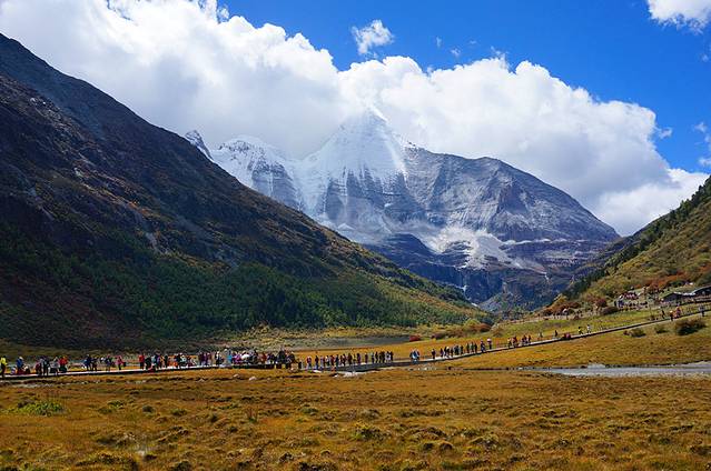 由于亚丁景区是在海拔4000米的地方,所以从3000米左右海拔的香格里拉镇上去只能坐观光车,单程30公里的盘山路,50分钟左右。在十一期间排队坐观光车一个半小时起,所以童鞋们尽量赶早吧