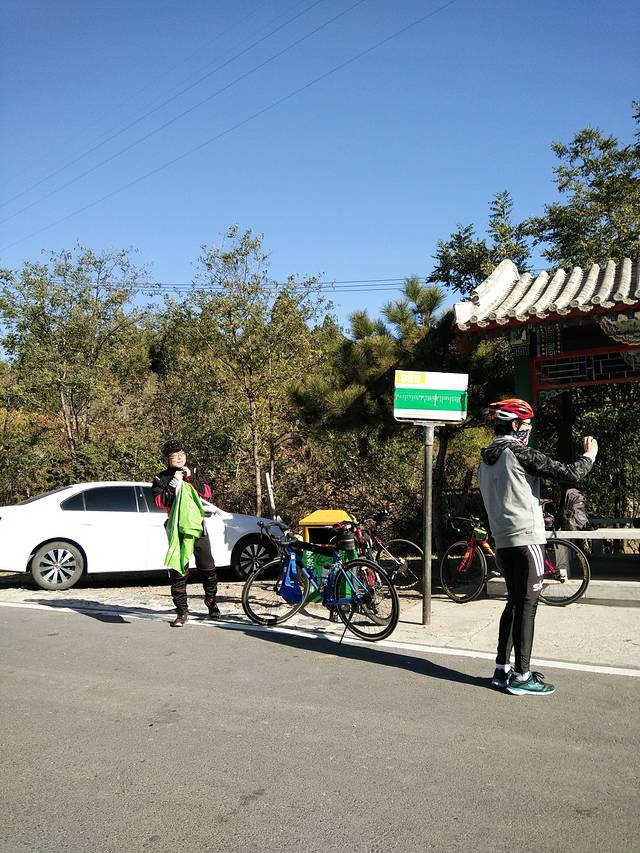 天气好,骑车爬山的人还真不少,相对丰台、石景山、海淀、门头沟的骑行的人较多,苦逼的我们是从通州帝国骑过来的,到山脚的牌楼就60公里,太废腿了!
