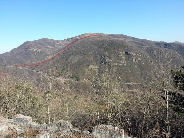 看那边山头上有个小白点了吗?对,就是那儿,下一个目标“阳台山”,但有4公里盘山道,红线上方就是我们计划要走的地方,红线中间上方白色的Z字型就是盘山道,照片上有点看不清楚。