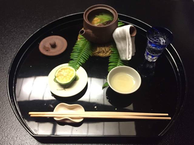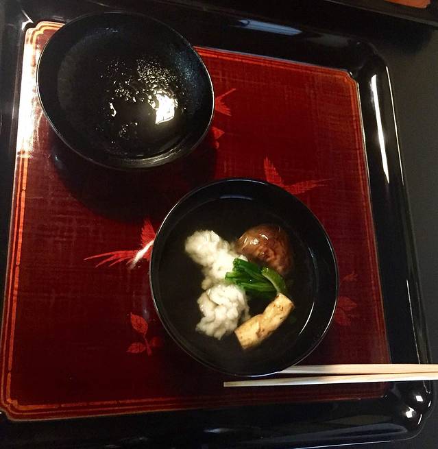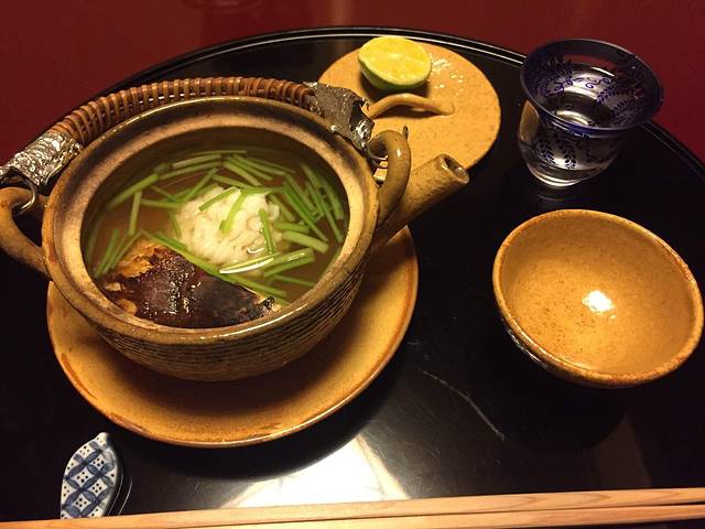 接下来是碗物,布丁以后享用温暖的碗物倒是不错。松茸与海鳗,京都秋天碗物中几近必然出现的味道。食材一样,但食器却有差别,吉泉的小壶。