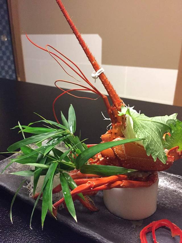 用龙虾做容器的一道菜,我觉得很像日本的花道,非常美也非常有韵味。像他们表达了我的赞誉,对方非常开心。