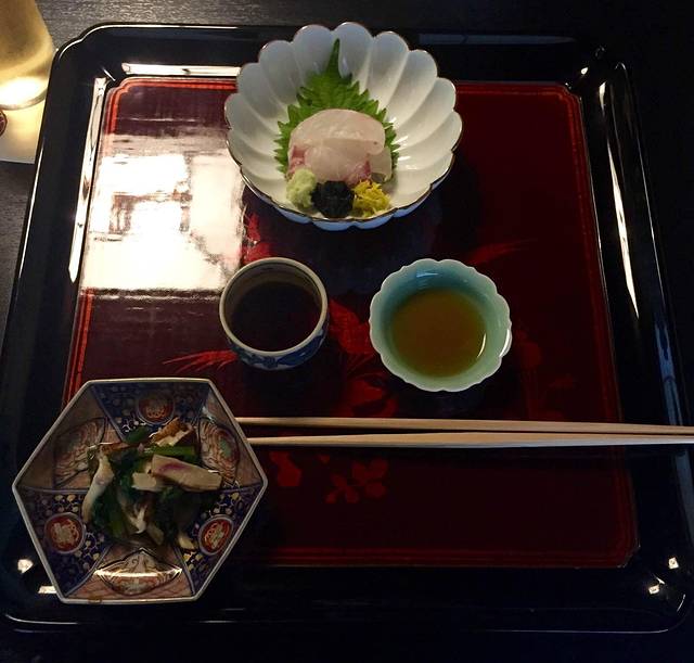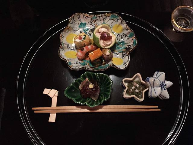 首先食前酒干杯,在日本的习俗里,怀石最初的第一杯是献给神明与上苍,感谢万物爱戴。我不信此,不如感谢为我预约成功的酒店。