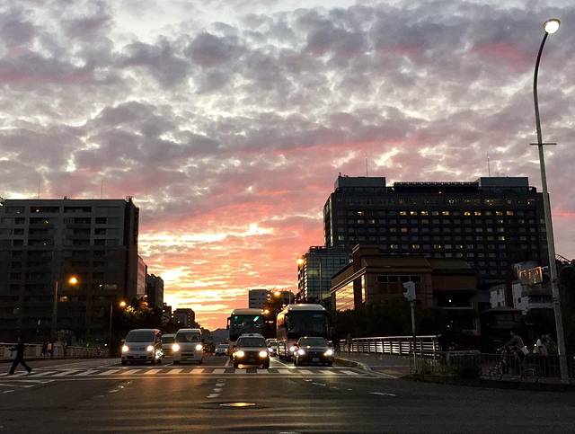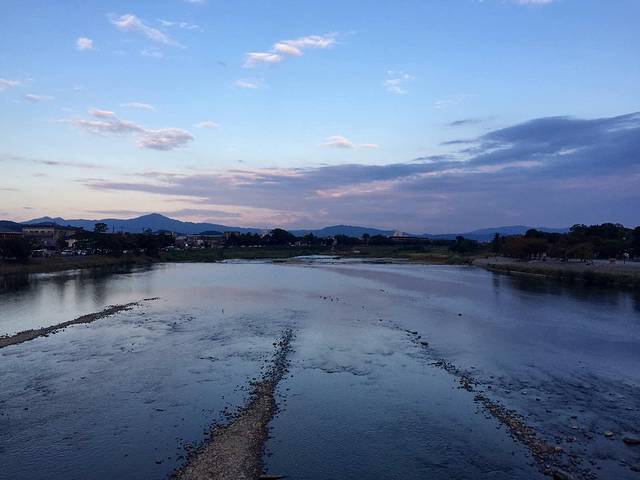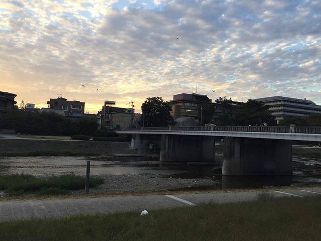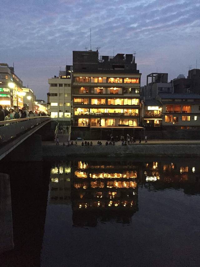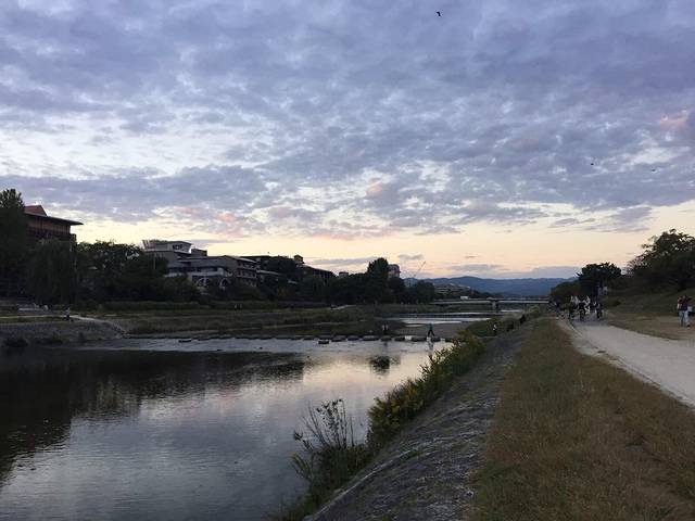 京都的周末,河的一边是连成一片的餐馆,商业,人们聚在河边嬉笑打闹,另一边是安安静静的小道,三三两两的恋人沿坐到河边谈情说爱,跑去街边买来啤酒席地而坐,凉风吹过衣角,看静静流淌的鸭川…