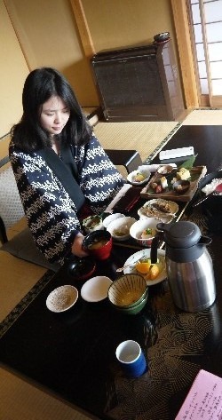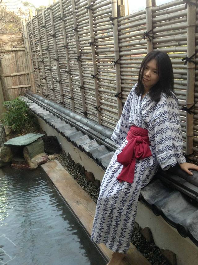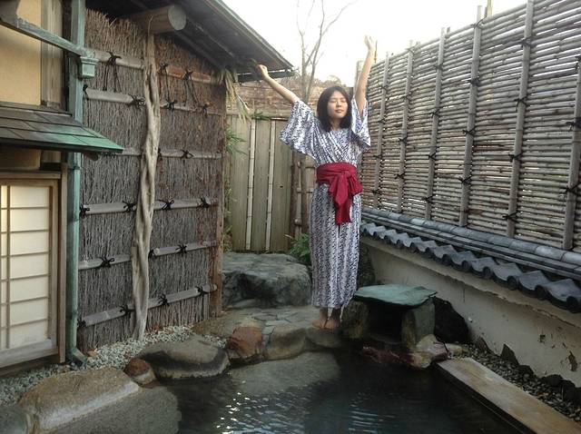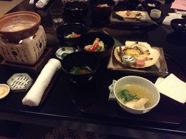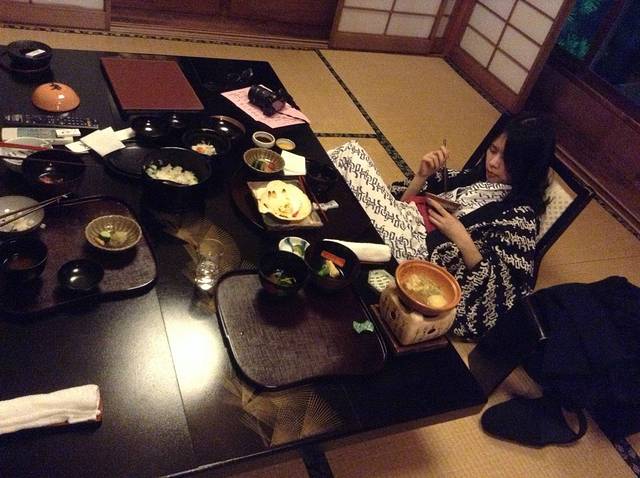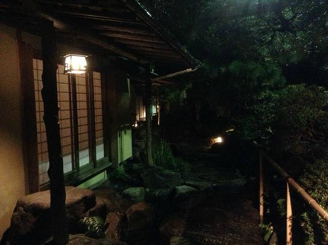 晚餐各种缤纷的料理吃。有身着和服的服务员和日式庭院,晚上幽静的好像世界不存在了一样