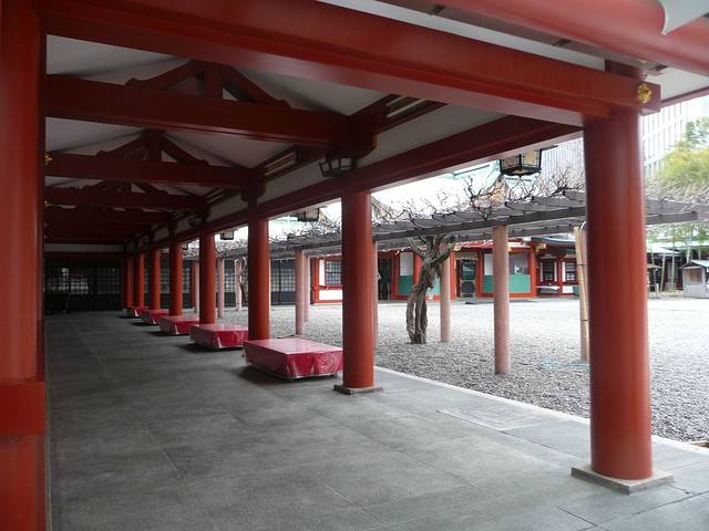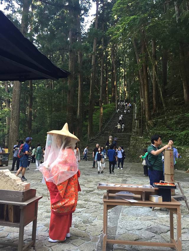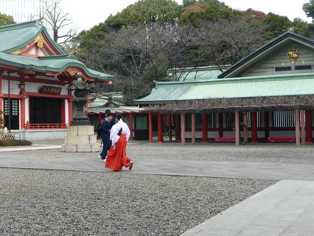 清晨睡到自然醒,在酒店窗边看见下面有个神社走过一排身着传统服饰的人,好奇之下迅速穿衣下楼,穿竹林小路五分钟就到了名叫日枝的神社,无心插柳的看到日本人前来参拜的人投幸运币,摇铃,鞠躬,祈祷的样子。