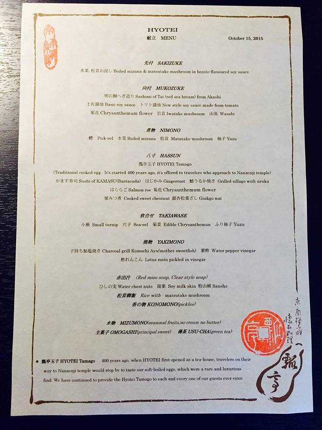 年度最佳。吉兆。基本是迄为止吃过的怀石料理中最好的两家之一。同样是三星,踏进第一步就感受到这家不会错。服务好却不过头,菜的做法,搭配,环境都是一等一的棒。相比前天的真的太逊色,如果说唯一的缺陷就是性价比低。服务员去打印今天的菜单了,容我在这里继续激动一会好吗。