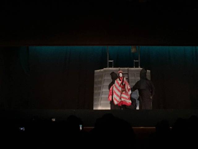 本身是为了和舞台后的背景融为一体,可是在这儿大家的注意力完全被吸引到黑衣人身上了。