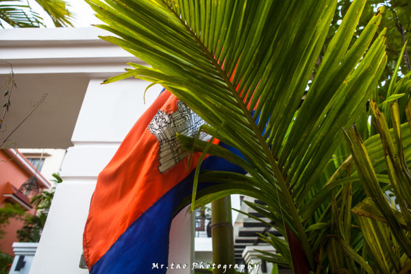 柬埔寨的国旗,由三个平行的横长方形相连构成,中间是红色宽面,上下均为蓝色长条,红色象征吉祥和喜气,蓝色象征光明和自由。国旗中间绘有白色镶金边的吴哥窟,象征着柬埔寨悠久的历史和古老的文化。