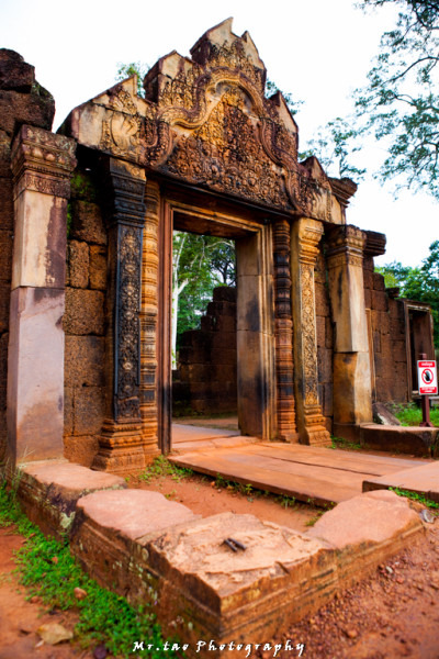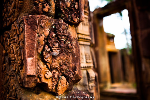 建造女王宫的石头全以红砂岩构成,呈现出美丽的粉红色。当我踏着这片红土地进入女王宫时,内心惊叹不已。古代的工匠竟然可以把坚硬的石块,如雕刻木头般雕琢出深邃的纹理,分明的层次。不论门框、石壁还是窗棂,都镂刻的巧夺天工,精妙绝伦。。