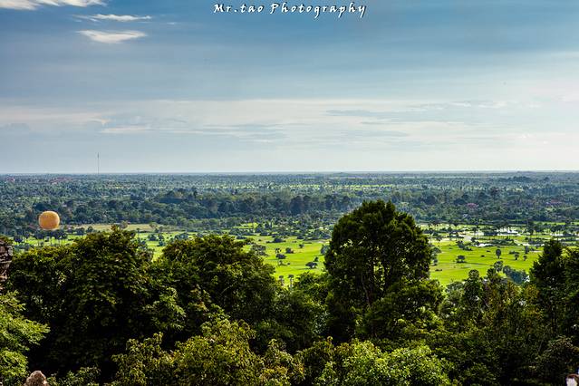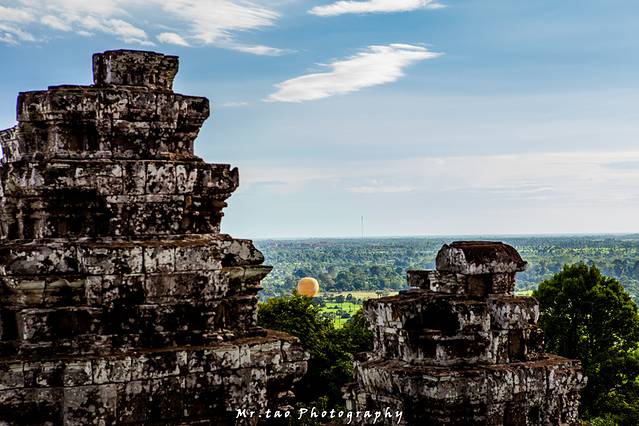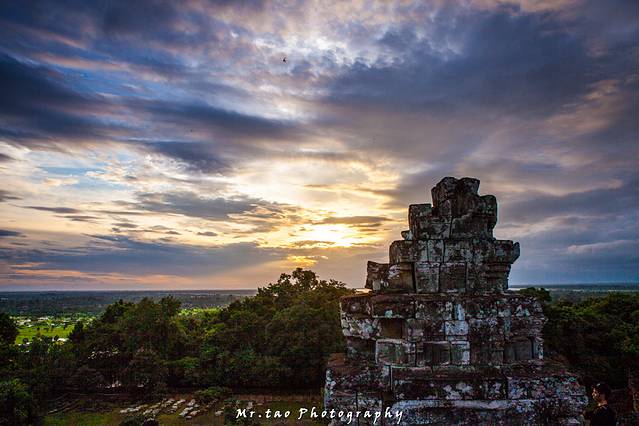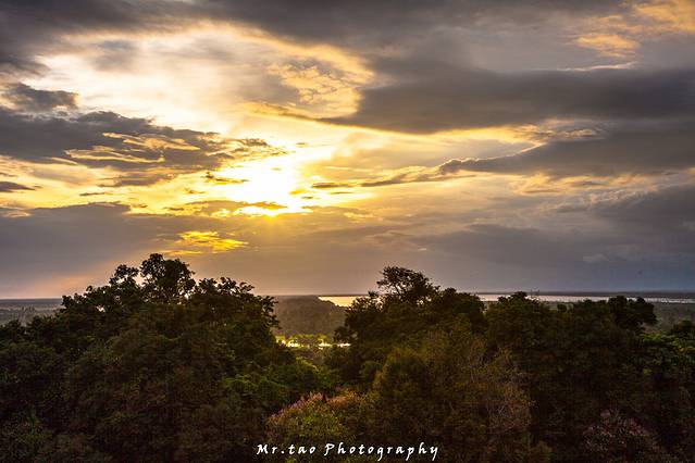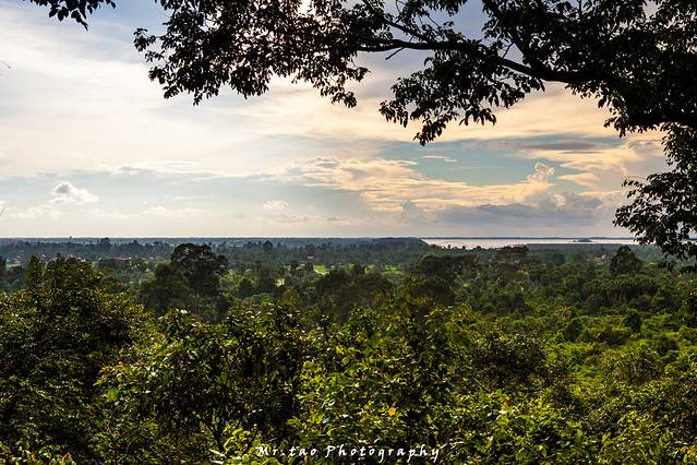 巴肯山虽然不足70米,但已成了吴哥区域为数不多的制高点之一,向北,近处的吴哥城被树林包裹的严严实实,不露一点痕迹:向南,吴哥寺从郁郁葱葱丛林中探出金灿灿的头来,来本灰黑的宫殿被夕阳镀上了金。