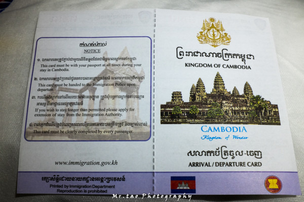 上飞机以后,乘务员会把出入境卡发给你填写,语言为柬文和英文,如果有什么不明白的可以咨询乘务人员,在过暹粒海关的时候,离境卡会和你的护照放在一起,出境时就不用再另外填写了。。。