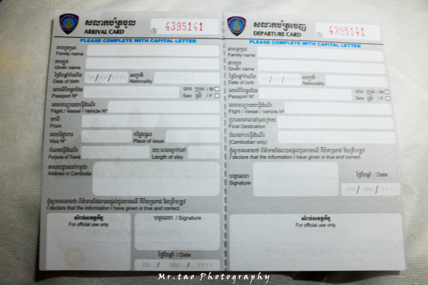 飞机上空姐会发柬埔寨的出入境表格和海关申报表(有不明白的都可以问空姐)Arrive和Departure两张都要填写,过关时Arrive那张会被收去,Departure那张会留给你。