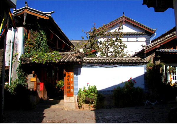 高高低低的石子路上,路边是纳西人家泥土砌成的院墙,院内入目即是一树繁花。