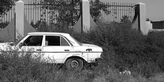 村子里随处可见被拆迁的房屋以及废弃的物件,这辆报废的车子更是增添了荒凉的感觉