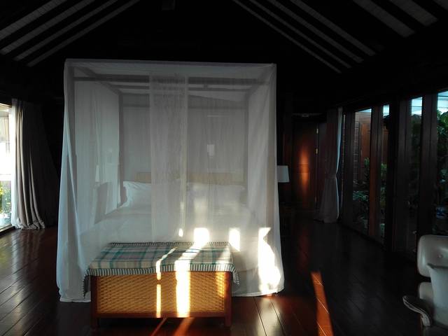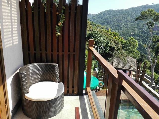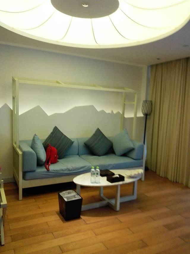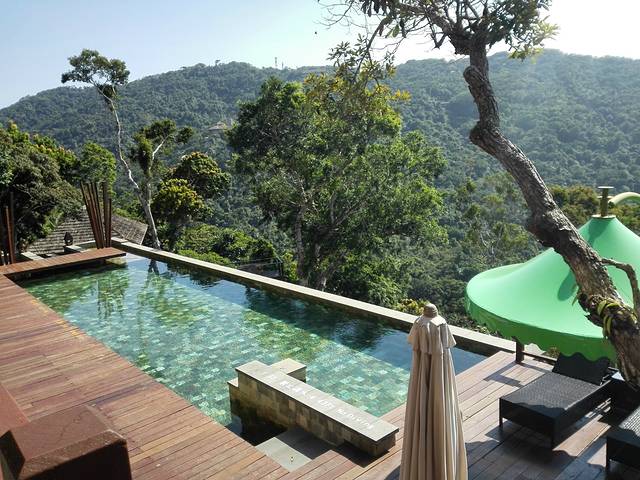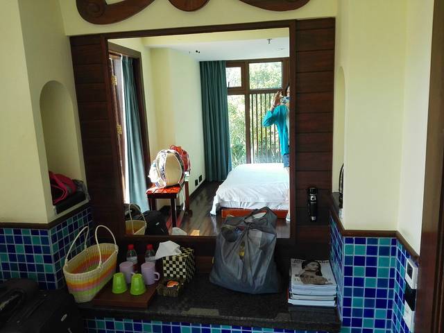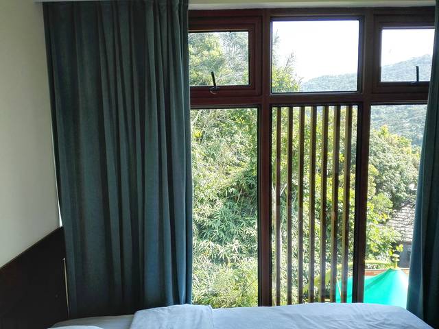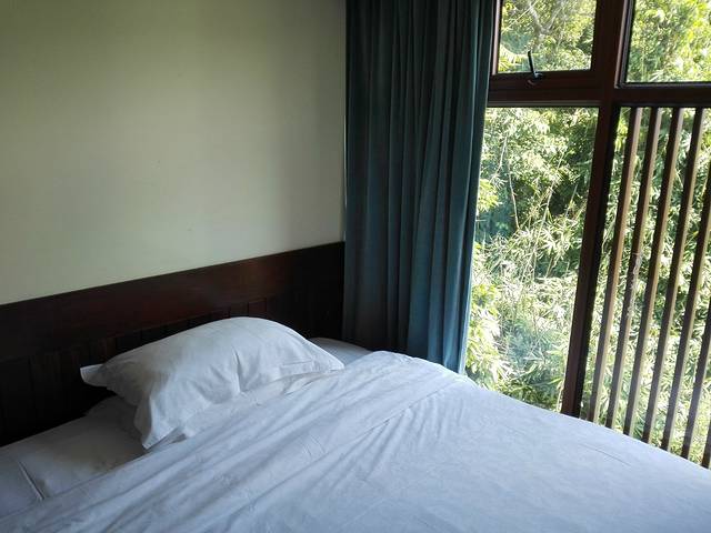我们住的是麻雀房,最优惠的那个。位置在半山腰吧,我估计的。离泰餐厅很近,西餐厅楼下,对面就是服务点。就这一点来说,麻雀的便利性还是很好的。估计是因为我们来的比较早,或者人品也不错,前台帅哥安排1607给我们。这里简单介绍一下麻雀房。麻雀顾名思义房间比较小,而且是公用洗漱室的,分为楼上楼下两层,浴室在一楼那边,洗漱室倒是楼上楼下都可以。(唯一问题就是没有热水,不管是楼上还是楼下或者在老鹰房峭壁泳池的更衣室,开了十分钟都没有,问了服务员也没有解决。这点不好,虽然可以洗冷水澡…)一下子感觉回到了学生时代。1607是二楼最里面的房间,据说是最大的一间(其实不算大,一张大床,两个女生如我们可以凑合,如果个子再大点,还是考虑其他房型哈),来的时候服务员正在做卫生,态度超好,还和我们聊天,说这间是唯一有空调(中央空调)的麻雀房。那天到的时候下午气温在31度左右,空调都有点不够用的感觉。不过他说晚上其实很凉快,不用空调还会觉得凉。事实证明他说的非常正确。1607房面对大山,阳台下面是游泳池,另一边是落地窗,采光极好。房间虽小东西比较齐全!提一下他家提供的头梳是一个小牛角梳,被我A了现在放包包里备用呢。对了,还有一个重要的问题就是插座太少,就桌子下面的一个,烧水都不知道房间里面那里可以,后来是拿到房间外面的区域随便找了个插头烧的水!