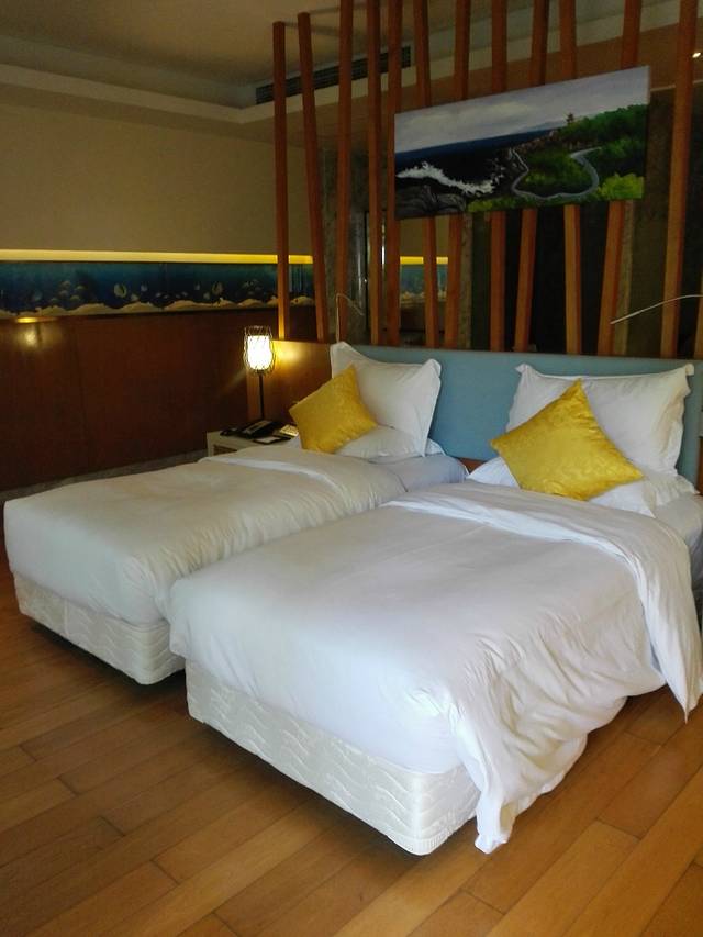 房间在3208,这里要说一下,大堂是在3楼哦,餐厅的话在一楼,如果是海景房楼层就会比较高,整个酒店的布局可以看我发的酒店示意图,2,3,5号楼下都有泳池,如果住一楼可以从阳台直接下水,我们订的是园景房,曾看到其它的人给免费升了海景,不过我们这个时间估计是旺季,前台妹子说没有海景房升级了,不过也帮我们升到是池畔房楼上。就是现在看到的这个,她说如果是园景也就是我实际入住的房间对面,看到的会是远处正在施工的另一个酒店的工地,就不够美了。在这里还是要再给这个妹子一百个赞。房间足够大,还有配备温泉浴缸,游泳后回来泡个澡,出身汗,真棒。我不会告诉你我睡觉前还泡了一次。哈哈。