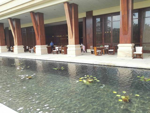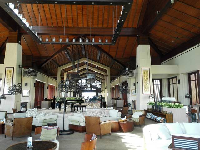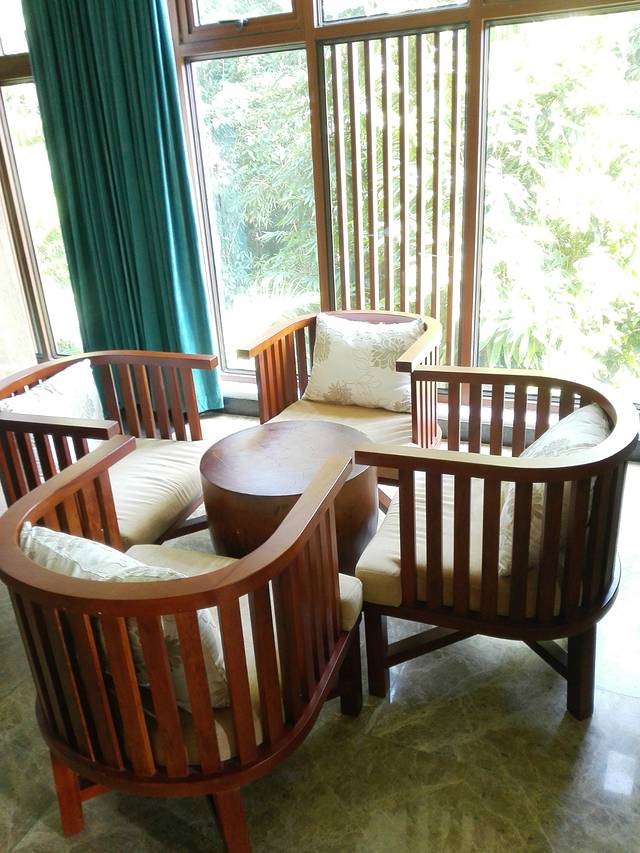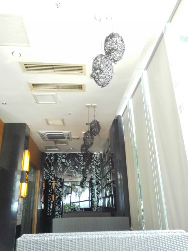 作为五星酒店,9号的服务绝对是到位的,到了酒店,有小哥接开门,接行李,到前台,美丽的妹子为我们登记入住。我们来的时间是1430左右,由于卫生还没有好,妹子建议我们把行李寄存在礼宾部,然后送了我们二人份的饮料券,对就是图上的二杯咖啡和曲奇。喝完咖啡,卫生还没有好,于是我们就在大堂里观察地型了。酒店大堂向外看,园林景致很美,可以看到不远处的主泳池和隐隐约约的海边椰子树。看了一会,心都动了,于是找妹子说我们要游泳,妹子又非常热情的为我们提供了保险箱放贵重物品,我们跑到一楼的卫生间换衣服(问了妹子,可以从大堂下到楼直接到泳池和沙滩)。结果,才换好就接到妹子通知说房间好了,好吧,心急吃不了热豆腐,还是先回房再说。这里要说明一下,服务员美女妹子态度太好啦,虽然有这么多波折,她的服务却让我们都觉得好舒心呀。