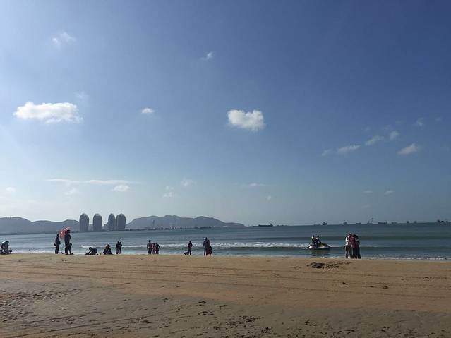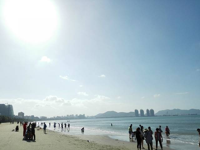 海滩上游玩的人们很多,随着时间流逝,越来越多。远处那四个建筑就是有名的凤凰岛,人工建出来的小岛。