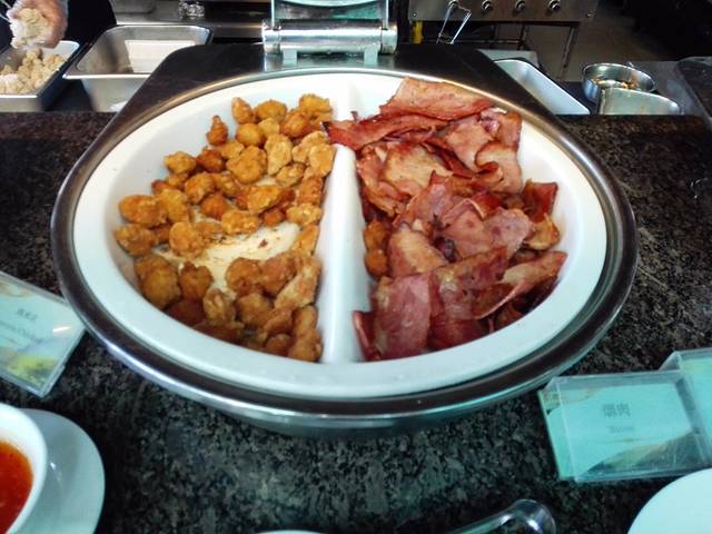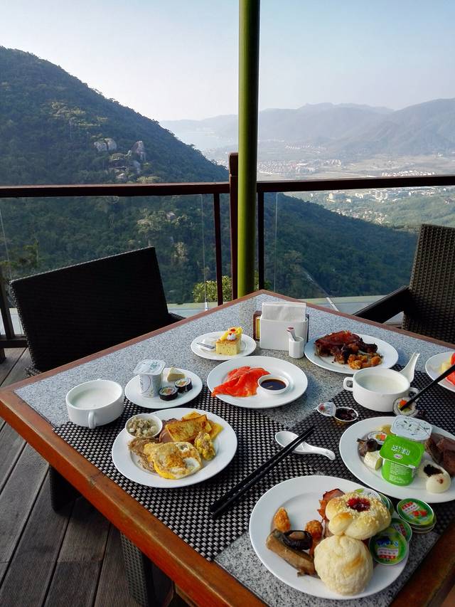 一早上睡到自然醒,当然早起看日出什么的,我们就不提这个了!出门溜达一小圈后,我们就会到楼上的飞龙岭西餐厅吃自助早餐。西餐厅在麻雀房楼上,之前就有听说内容是相当的丰盛。如今亲自一看,果然是名不虚传啊!首先是环境,我们运气还是好好的接手了一个外围的位置,可以一边品尝美食一边欣赏森林公园里的景色。阳光、大海、森林、微风,让人身临其境的感觉到了浪漫气息!其次早餐内容真丰富!除了前几天几家酒店有的食品外,飞龙岭西餐厅还提供了广式茶点和三文鱼刺身,西点的种类也更丰富,还专门为儿童设计了用餐区域,非常的贴心人性化!
