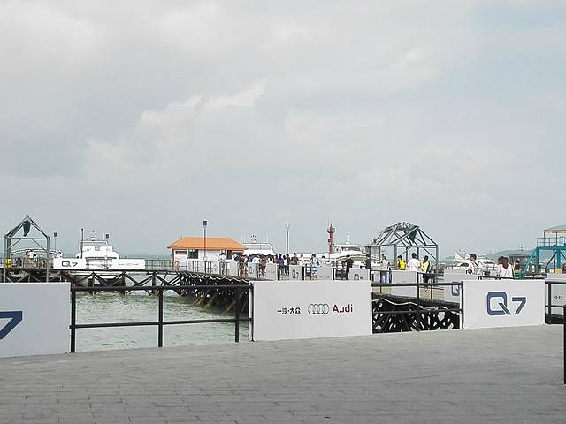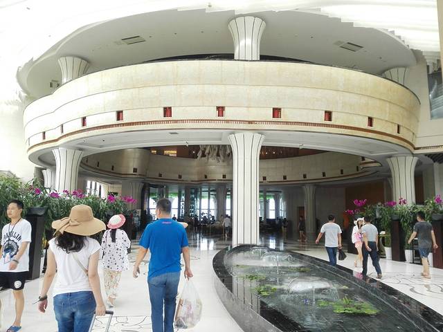 登岛的人真得是超级多,我们去的这天,风浪挺大的,船很颠簸,同伴都有点晕船了。好在第二天中午程的时候则风平浪静,让我们得以在船上好好欣赏那美丽的大海。到了码头,那是人山人海,不过酒店接待处也很显眼,只要走几步路过去,就安排电瓶车接我们到酒店大堂去了。直接接送到大堂。