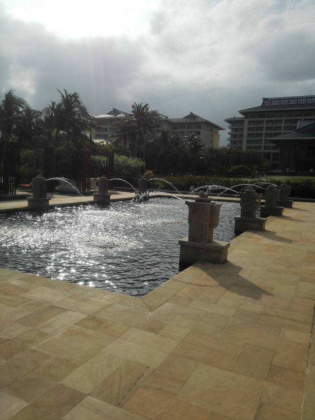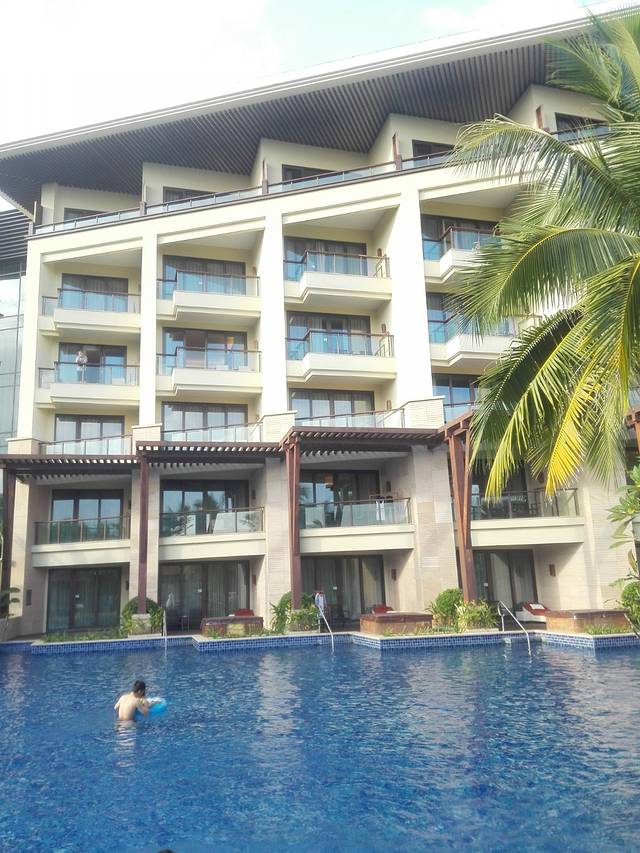 最重要的来啦,行李什么的放下我们二人就向泳池出发。下了楼,在楼下泳池里过了下水,游了一会,还是去大泳池玩吧。于是沿关绿荫盈盈的园景路,一边欣赏一边进发。说一下,除了泳池,还是儿童游乐池,适合小朋友们和家长一起玩,所以说,下次全家来度假的话,这儿真得是第一选择。风有点大,我们就不去玩小孩子的水上项目,到了无边泳池,开始水中游啦。。。。。。对了,无论哪一个泳池,边上都有服务生,提供泳巾,和救生服务,非常的贴心哦。晚上我发现楼下泳池里不有人在游泳呢。不过后来下了场突然的雨,于是估计大家就都散了吧。
