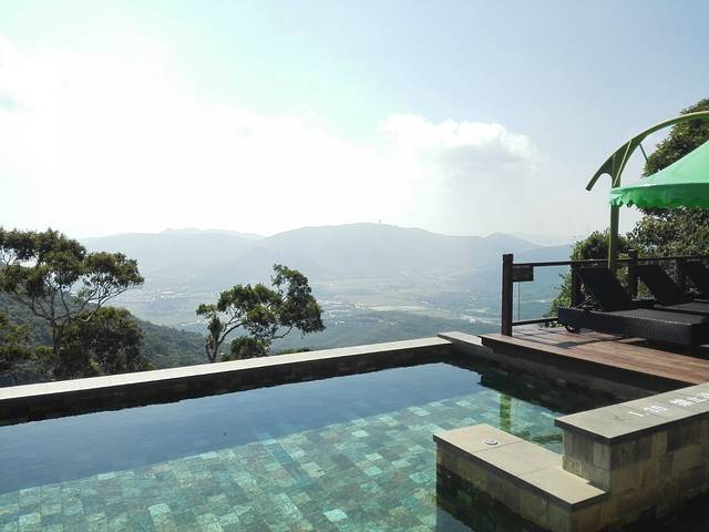 到峭壁天池的时候大概是1500左右,太阳挺大的,泳池边上只有4、5个客人,大家只是拍照没有下水游泳。试了下水温,还有点凉,泳池边的友情提示牌上写温度27度!不愧在山上啊!我们坐在遮阳伞下给泳池拍了好多特写,其他人慢慢都离开了,我们觉得太阳不太大了就换了泳装下手了!泳池看起来好像挺深,在峭壁之上超级有感觉,其实只有1米3深,安全性超高!
