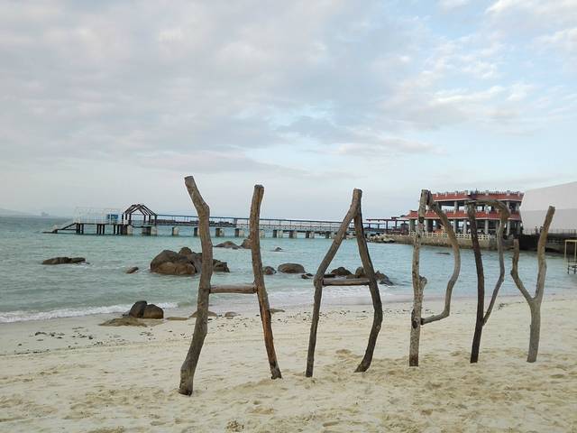 第二天起床后我们吃了早餐,五星酒店的餐饮都很丰盛,其中有一个椰子糕我最喜欢,后面在鸟巢也再没有吃到。然后再坐电瓶车逛了下冬季码头,也就是我们上岛的码头,好多水上项目,当然8点半后游人开始上岛,又开启了人人人的模式。脱了鞋子下了水,稍稍感受了一下,海水超级超级清,果然说是不输与国外的海,不过沙滩太粗,很多珊瑚粒,很是硌脚呀!