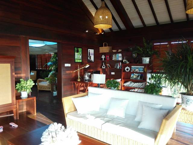 前文说到,由于来的那天风浪太大,所以同伴有点晕船,所以我们花了大概二个小时在房间休息。我们入住的是园景房,虽然对着道路,不过晚上和白天没有游人,倒也安静。房间超级大,海洋的装饰氛围,如果有小朋友来一定很开心,好多贝壳。房间就像家庭房一样可以分为会客区,梳洗区,浴室与洗手台是分开的,办公区,休息区和阳吧,阳台上还有一个可以浴澡的小澡池。阳台上的泡澡池,小哥说天天消毒,尽管给用。我晚上试了一下,水温偏低一些,不过还是不错的,可以边泡边看电视。 床头有一个灯光控制器,不错。可以根据自己需求的场景调节亮光。很智能的感觉。下午还送来了酒店赠送的水果,可惜没有芒果,好像是季节不对的原因。