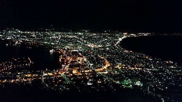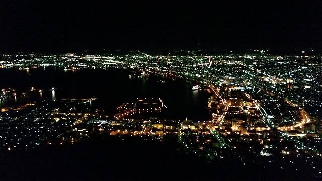 山顶上,整个函馆如同蝴蝶张开双翅般在眼前延展开来,强劲的海风四面八方笼罩全身,冷,真希望有一个温暖的拥抱。东京夜景给人动人的震撼,函馆夜景则给人浪漫的感动。这里,很适合恋爱中的人们。