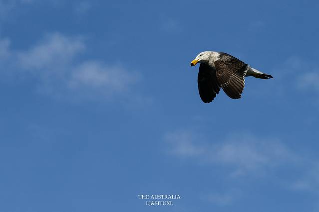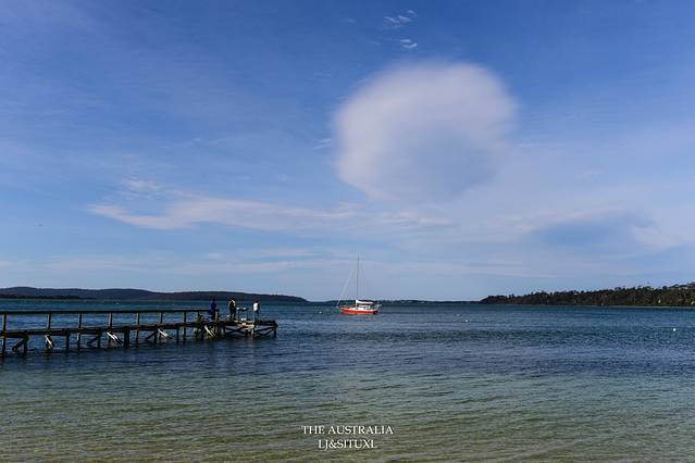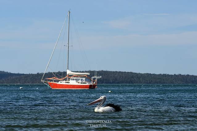 车子开到St Helen镇,途中经过Georges Bay,在这里停留,不是因为海滩,而是因为看到码头边有几只巨型澳洲鹈鹕,体型不是一般巨大,而且非常警惕,靠近不到十米,已经飞了……