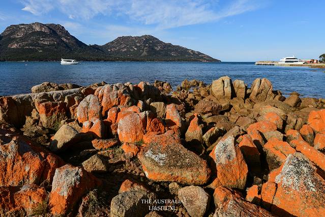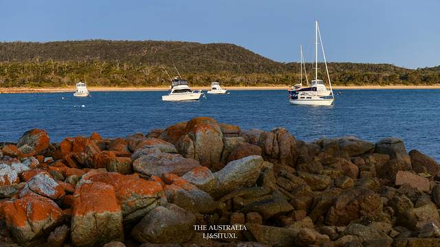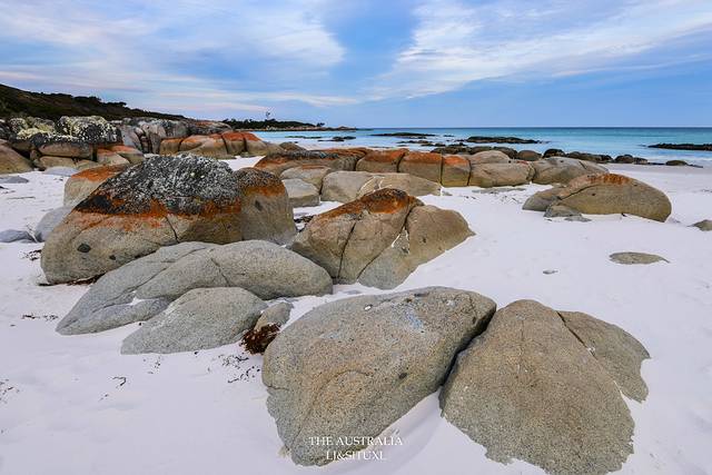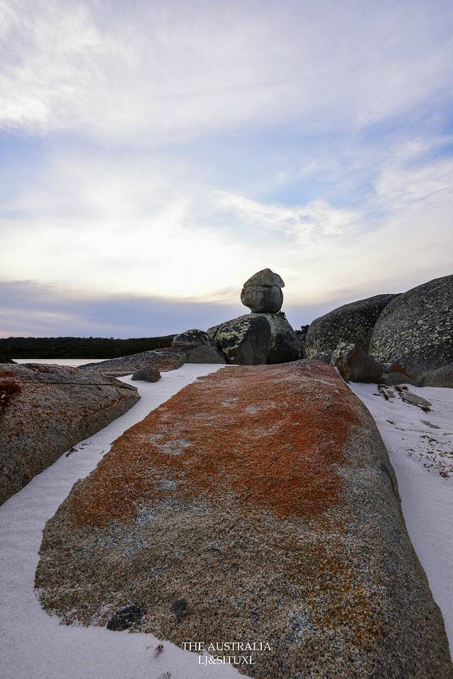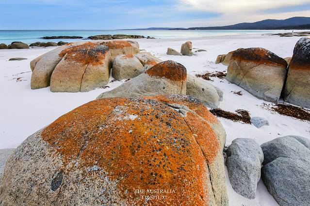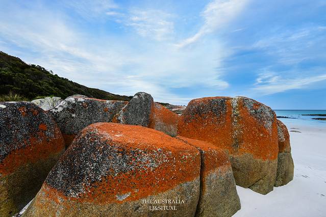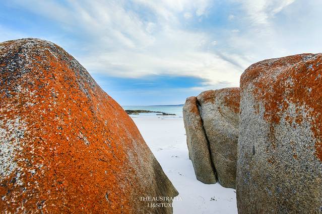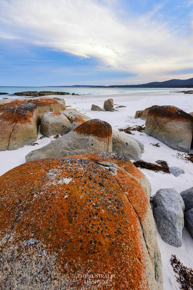 火焰湾(Bay Of Fires)是塔岛上最著名的海滩之一,这里以红红火火的石头而得名。石头表面生长着一种苔藓而呈现出橙红色。这里的沙子也是很细很白,沙滩上的一大堆红石,视觉上反而有点唐突。我们住Freycinet国家公园的Coles Bay那儿也能看到红石,因此对于著名的火焰湾,心理上还是有点儿落差。