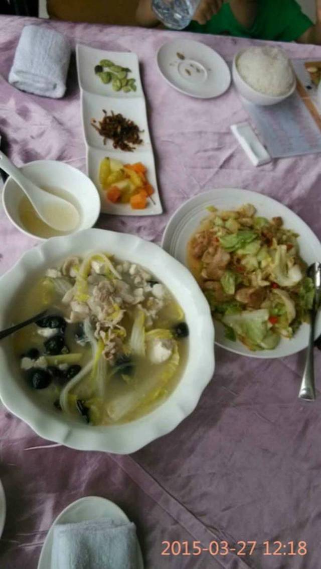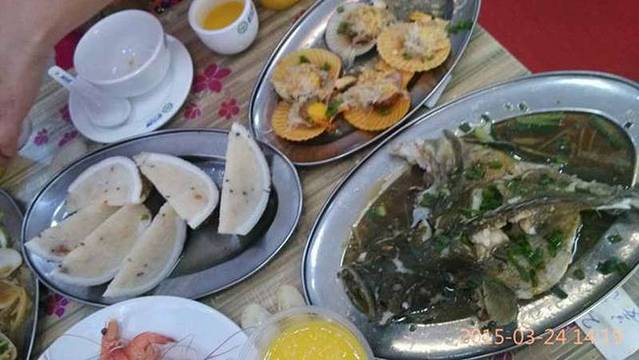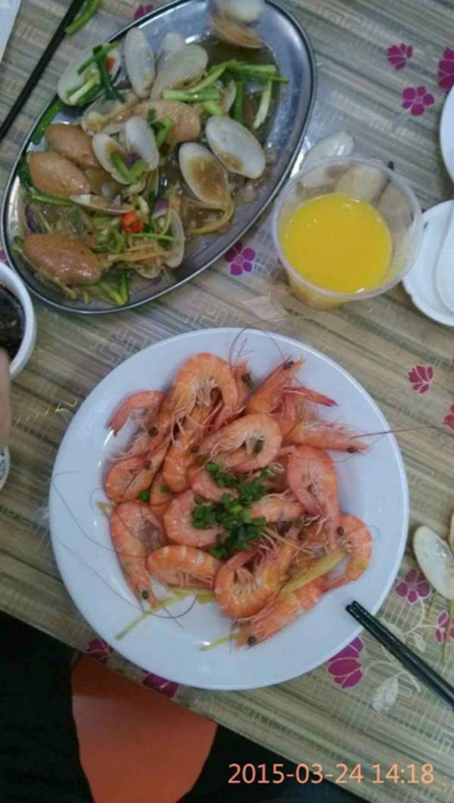 我们是在网上看到这家店的,美团上拍了他们的券,既可以冲抵现金,又可以打折,很优惠。我们第一天在第一市场买了一斤虾,一斤芒果螺,7个扇贝,一条鱼,做了6个菜,加上加工费总共不到250。4个人吃,很划算!店里的果汁是鲜榨的,芒果味的都很不错!