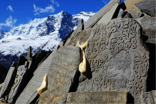 蓝天白云,雪山庙塔还有五彩的经幡,绝佳的色彩搭配